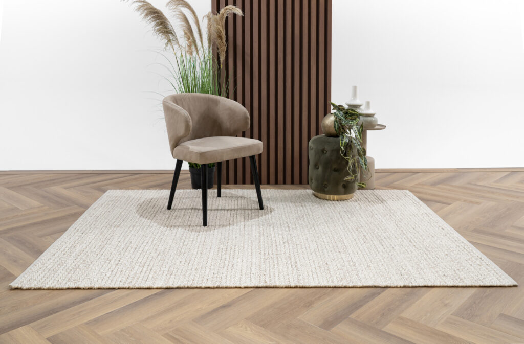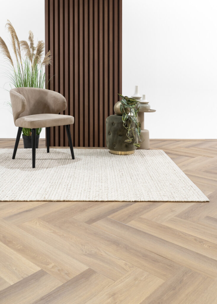 De planken zijn voorzien van een 4-zijdige V-groef, die essentieel is voor het strakke lijnenspel van de visgraat. Net als de rechte plankvariant is deze vloer geschikt voor intensief gebruik en bestand tegen zwenkwielen. Met brandklasse Bfl-S1 kies je bovendien voor een veilige vloeroplossing die technische kracht combineert met pure esthetiek.